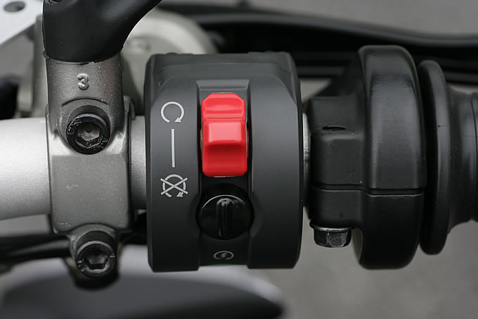 右側ハンドルスイッチには、セルスターターとキルスイッチが配される。赤い凸部がスライド式キルスイッチ、黒く丸い部分がセルスイッチ。スライド式のキルスイッチをオンにすると、セルスイッチが隠れて押せなくなるユニークな仕組み。