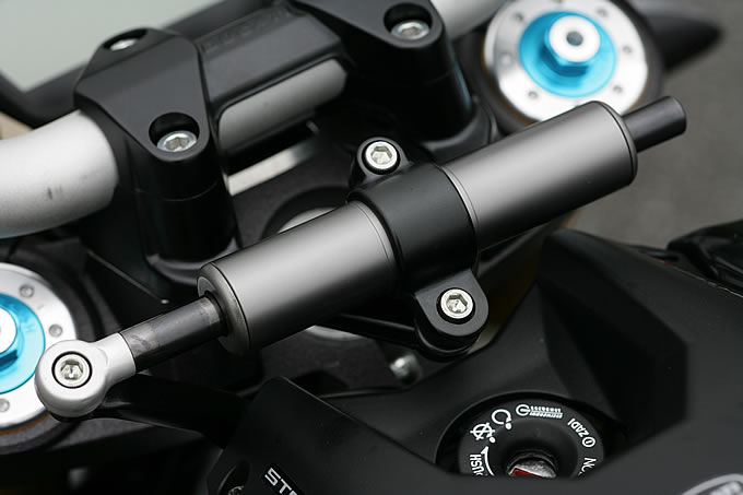 ハンドル手前に装着されるクロスマウントのステアリングダンパー。