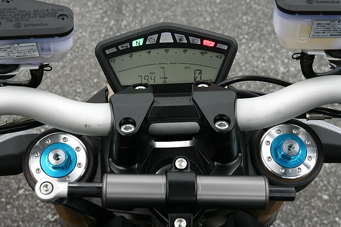 メーターには速度、エンジン回転数の他、水温計や気温計、温度計、トリップやオドなどが機能的に表示され、左ハンドルスイッチで操作する。パネルは液晶でバックライトは白、明るさを3段階に調節可能。前傾時でも見やすい配置とデザインだ。