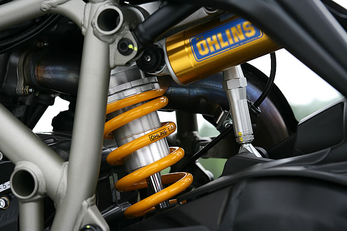 Sバージョンに装着されるオーリンズ製フルアジャスタブルモノショックのリアサスペンション。これも定石通り。