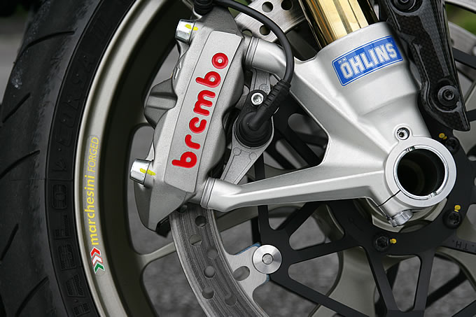 ここも定番、ブレンボ製4ピストンラジアルマウントキャリパー。もちろん高剛性を持つモノブロックだ。そのキャリパーの右に接続されているプラグはホイール回転速度を検知するもので、DTCを作動させるために必要なセンサーだ。もちろん、後輪にも同様のセンサーが装着されている。Sにのみ装着される。