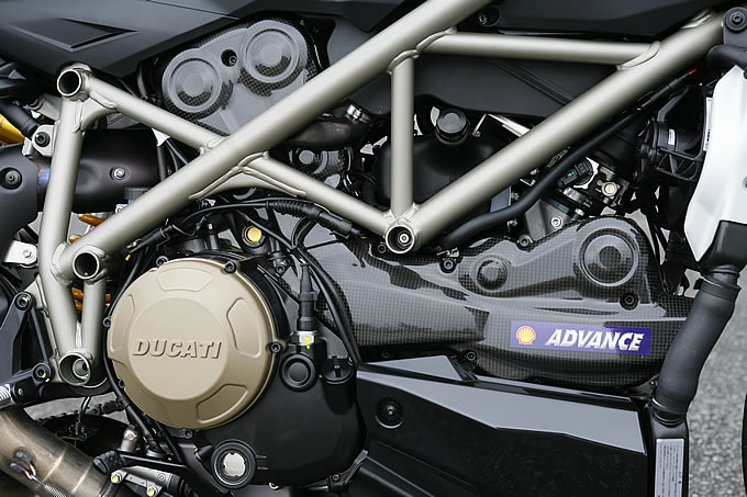 クラッチカバーは日本の騒音規制に対応するための専用パーツ。エンジンでは、クランクケースが見直され、剛性を高めるとともに1098よりも3kgもの軽量化を達成している。これも合わせて、Sバージョンは無印よりも乾燥重量で2kg軽い。