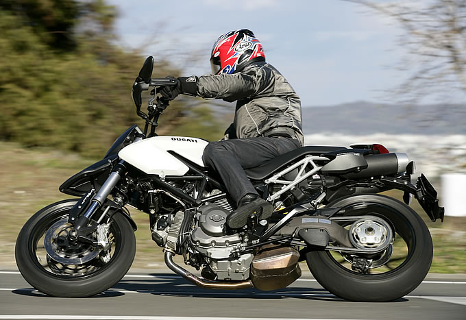 そもそも、モタードモデルのオフロードスタイルのライディングポジションというのは、マシンコントロール性が高いスタイルである。マシンをアグレッシブに操ることができて、体重移動の自由度も高いからだ。また、モタードマシンそのものも、オフロードバイクがベースで、積極的な走りに応えてくれるものとしている。普通のロードスポーツがベースでは、せっかくのライディングポジションを活かせる運動性能も期待できないわけで、実際そんなモデルは存在しない。だが、Lツインのドゥカティはそれを可能にしてしまったのだ。ハイパーモタードは、モタードスタイルのライディングポジションで乗るドゥカティなのである。