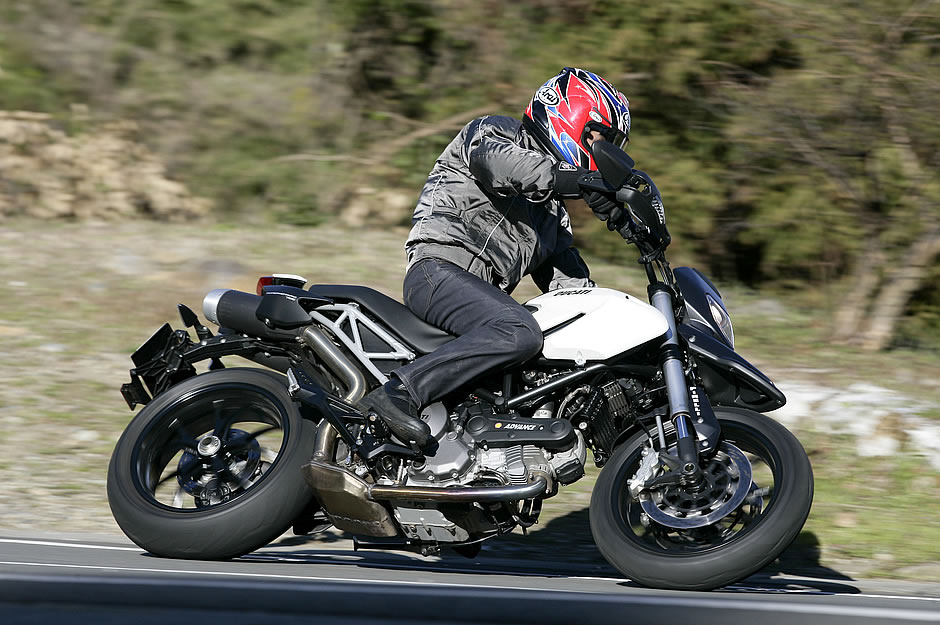 そのうえ程よい排気量によってトルク感もまさに中庸。同じエンジンを搭載するモンスター796よりも、スロットルレスポンスは悪く言えば緩慢であっても、ハイパーモタード796では大きい姿勢変化とうまくシンクロしてくれるのでマッチングも上々だ。フロントブレーキも効きがまろやかだから、しなやかに動くサスペンションとの相性も良く、姿勢変化をコントロールしやすい。違和感なく、大きく姿勢変化させてのライディングができる。