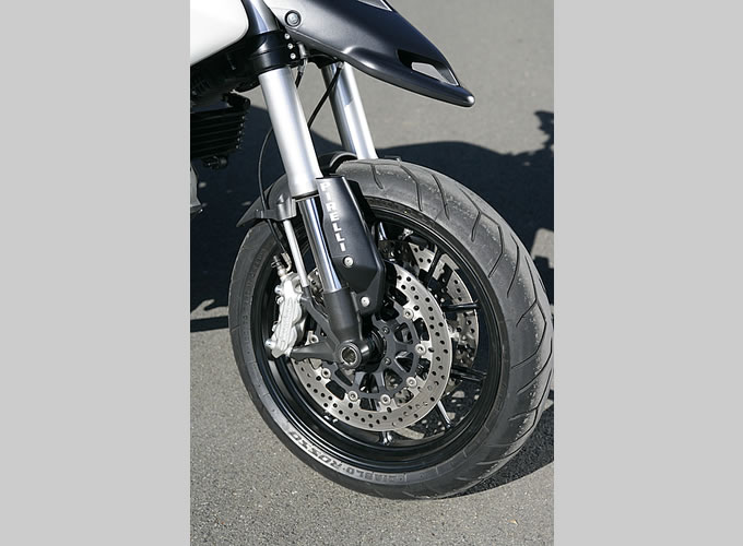 サスペンションストロークが、一般的なロードスポーツの前後120mmに対して、ハイパーモタードのそれはフロント165mm、リア141mmと大きいのも、積極的に姿勢変化させて運動性能を引き出すためだと考えていい。もっとも、荒れた路面や歩道など段差の走破性に優れ、気合いを入れてマシンコントロールを楽しむには良くても、漠然と乗っていては、こうした設定は必ずしも具合が良いことばかりではない。うまく乗れば大きい姿勢変化を活かせても、リズムに乗れないと挙動を乱すだけだからだ。それに、サスペンションストロークが大きいと車高が高く、足着き性も犠牲になる。また、燃料タンク容量は、12.7リットルと小さい。体重移動の自由度を追及した結果でもあるが、これはハイパーモタードのキャラクターを物語っていると言っていい。ツーリングで使うよりも、短い距離を集中して楽しむのが身上なのだ。