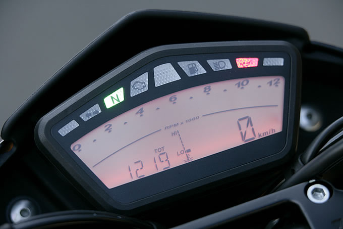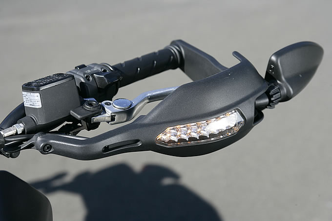 まず嬉しいのは、シートの着座位置近辺がえぐられるように低くなっていて、1100と比べてシート高が20mm低い825mmとなっていることである。おまけに前後サスペンションは日常域で適度に動いてくれ、跨ったときの沈み込み量も大きいのか、足着き性はかなり改善されている。また、相対的にハンドル位置が高く、アグレッシブに身構えていたライディングポジションは、一般的なオフロードモデルに近い自然体となっている。