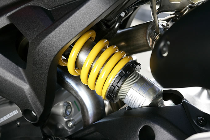 車体のフィーリングは、トラスフレームを持つドゥカティ以外の何者でもない。あのパイプが突っ張りながら段階的に撓んでいく感じは、ドゥカティならではの魅力であり、ときとして小難しさも出てくるが、これにアクの強さはない。前部のトラス構造部とリアフレームを兼ねた後部のダイキャストメンバーから成るハイブリッドフレームは、特にトラス部が高剛性で、トラスっぽさが抑えられ、落ち着きを感じさせる。