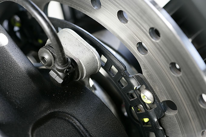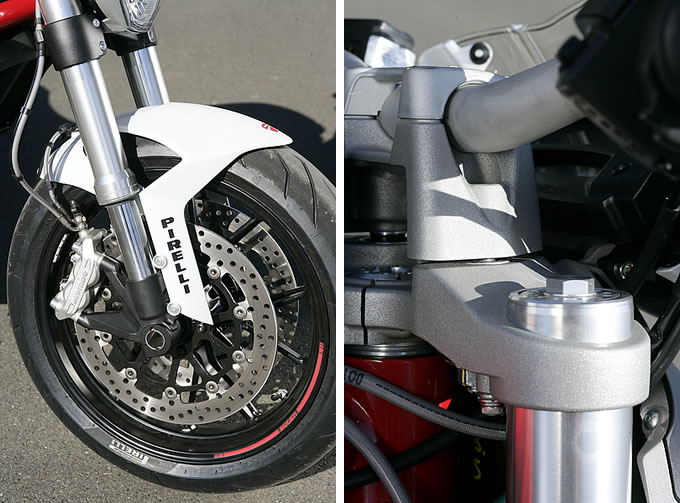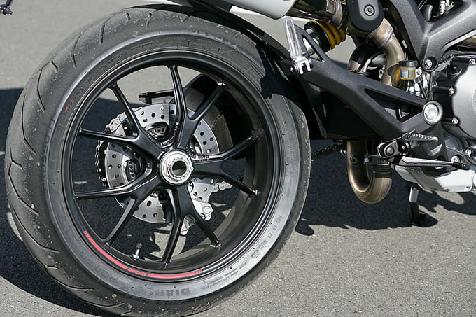 そのため、モンスター796では車高が高められている。しかもリア側のほうが高くなっていて、車両姿勢はやや後上がりである。これが豊かな荷重移動とピッチングを生み、コーナリング性能を高めているのだ。しかもタイヤは幾分ハイグリップ指向のものが採用され、高められた車高が180にワイド化されたリアタイヤとマッチング、積極的な荷重コントロールでのライディングに仕向けられる。そのため、ワインディングで一層スポーティに走りを楽しむことができる。