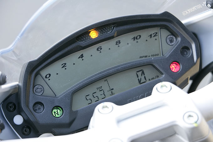 もちろん多くの人にとって、街乗りでは696に軍配が上がるかもしれない。696のほうが車高の違いでシート高が 30mm 低く(この数値差ほど足着き性の違いは大きくないが)、取り回しが楽なのだ。加えて低重心化による安定感にも勝り、前後の荷重移動やピッチングにシビアさはなく、全てがイージー指向に振られている。