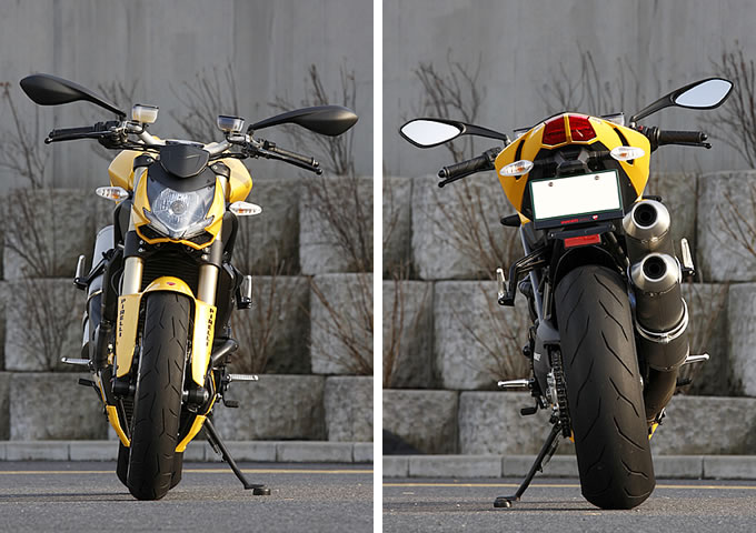 小振りな顔は、兄貴分と変わらぬストリートファイター848のルックス。ボディカラーはレッドとダークステルス(つや消しブラック)の他に、ご覧のファイターイエローが選べる。ファイターイエローは、少しゴールドが入ったような高級感のあるイエローペイントだ。