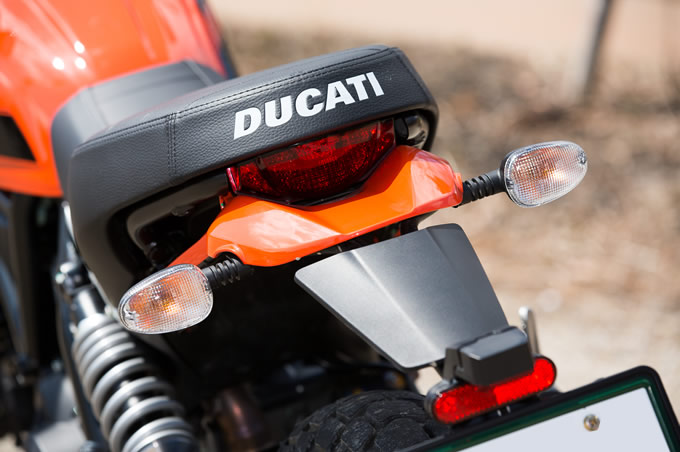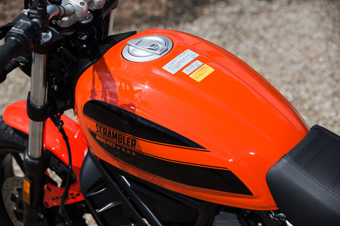 目の前に佇むマシンは見慣れたドゥカティレッドとはやや趣の異なるオレンジカラー。あえてレトロ風としたロゴとグラフィックが今の時代には新鮮に見える。