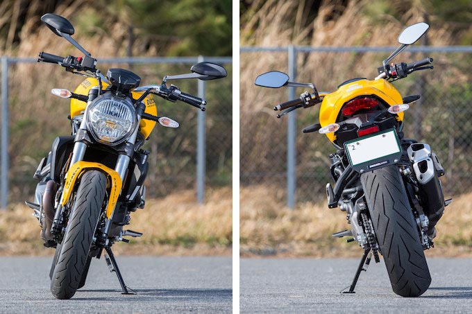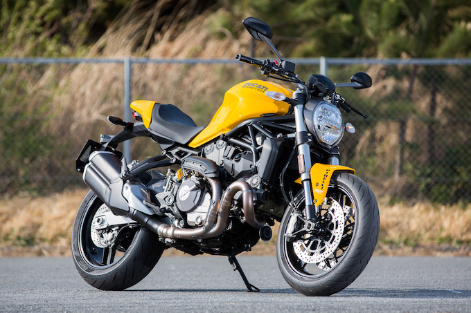 その25周年を記念して登場した新型821ということで、従来型をベースに細かい部分をきっちり仕上げてきた。ユーロ4の排ガス規制がほぼ世界標準化されたことも大きいと思うが、今回から最高出力値やマフラー形状も本国仕様と共通になっている。タンクまわりなどをシェイプしつつ、LEDライトやTFTカラーディスプレイを新採用するなど装備もグレードアップしている。個人的にはライダー側のステップが独立構造となったことで、ステップワークがしやすくなったことが嬉しい。