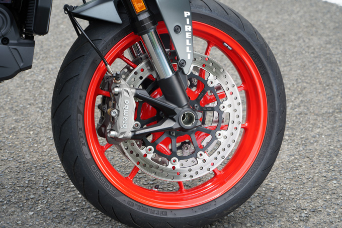 威勢の良いサウンドを発するLツインデスモに火を入れて走り出す。まず、軽い。とにかく車体の動きが軽いのだ。乾燥重量は166kgとされており、9.5Nmを6500回転で発生させる太いトルクを持つ新型エンジンを組み合わせているのだからそう感じるのは当たり前とも言えるが、いとも簡単にフロントは浮き上がってしまう。パワーバンド域では吸気音も変わり、ライダーの気分を高揚させてくる。