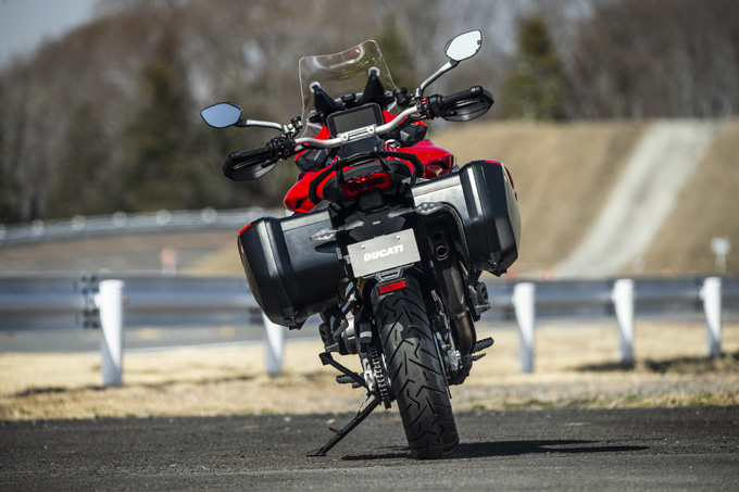 また、ブラインドスポット検知機能(BSD)はバックミラーに映らない死角にいるクルマやバイクを検知しミラーに埋め込まれたLEDインジケーターが点灯、それに気付かず車線変更しようとウインカーを出すと点滅によって警告してくれる賢いシステムだ。最近の4輪にはこれらのシステムは既に普及していて、経験者であれば「あ、クルマと同じだな」とその便利さをすぐに理解できると思う。無くてもすぐに困るものではないが、特に雨天や夜間、長時間走行で疲労しているときなど、条件が厳しくなるほどそのメリットや有難さを実感するはず。こうした先進デバイスの数々は、ムルティの長距離ツアラーとしての価値をさらに高めてくれるだろう。