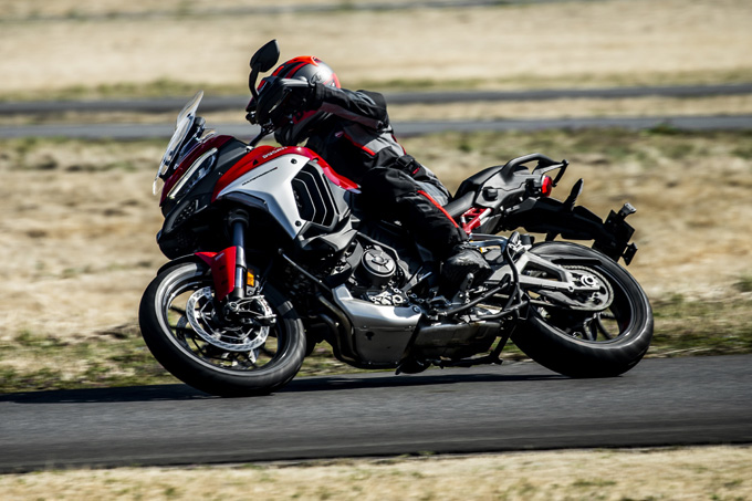 パイロンスラロームでは左右に切り返しながら低速域でのハンドリングを確認したが、まるでエンジン部分にマスを感じない不思議な軽さがある。明らかにエンジン上部にマスを感じたLツインとはだいぶ違う感覚だ。急制動でも100km/h近い速度から文字通りのフルブレーキングを試みたが、スポーツ設定のABSがタイヤのグリップ限界に近い領域で何事もなかったかのように最短距離で止めてくれる。ロック&リリースで制動距離が伸びてしまう通常のABSとはレベルが違う。