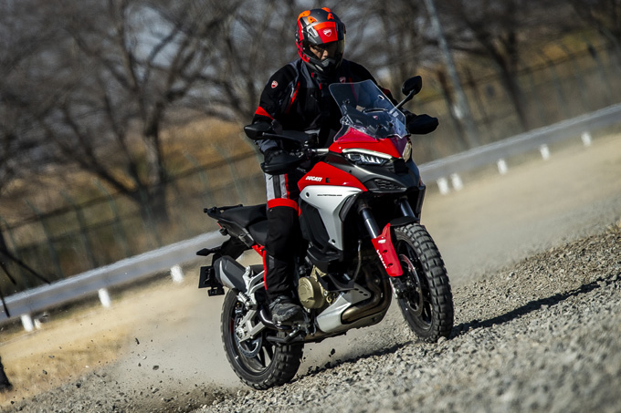 延長されたスイングアームにも注目したい。横から見れば一目瞭然だが、スイングアームピボットは前後アクスルのちょうど中間辺りの位置にあり、まるでエンデューロモデル並みの長さ。因って立ち上がりでスロットルを開けつつ、後はトラクションコントロール任せで適度にテールスライドしながらマシンの向きを変えていくことも割と簡単にできてしまう。さらに大幅に増えたロードクリアランスと熟成された電制スカイフックにより、ちょっとした法面(のりめん)を利用したジャンプなども軽々とこなしてしまう等々、アドベンチャーライダー憧れの走りを現実にしてしまう。これもまたV4エンジンあってこそなのだ。そう考えると、歴代ムルティが求め続けてきた「4 bikes in 1」の理想をさらに次の次元へと押し上げるための解答がV4だったということになるだろう。