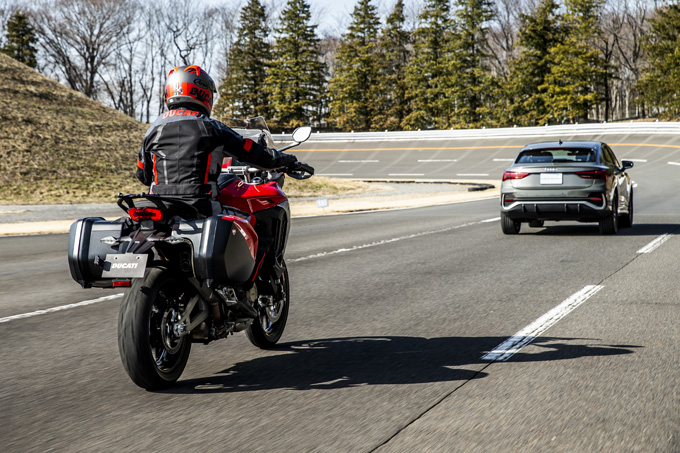 最後にもうひとつ、レーダーシステムについて。アダプティブ・クルーズ・コントロール(ACC)は前走車がクルマであってもバイクであってもほぼ瞬時に補足して自動的に最適な車間距離(正確には車間時間)を保って追走してくれる。実際にバイク4台で前後一列になってACCを試してみたが、高速道路で想定されるような緩やかな速度変化には十分対応できた。ただし、千鳥走行のように前後のバイクが極端にオフセットした場合や、渋滞末尾で急ブレーキをかけるようなシーンではACCの対応範囲を超えてしまうこともあった。勘違いしてはならないのは、ACCは自動運転や緊急停止ブレーキではないということ。また、30km/h以下の速度や、回転数とギヤ段数が不適切な場合ではACCは解除されてしまうが、これは2輪という乗り物の特性と安全面への配慮からだ。