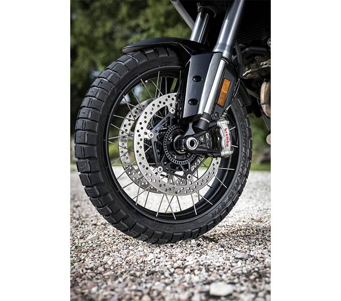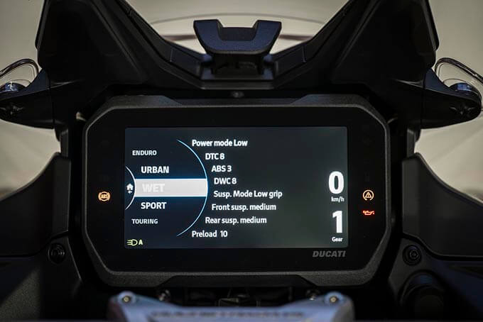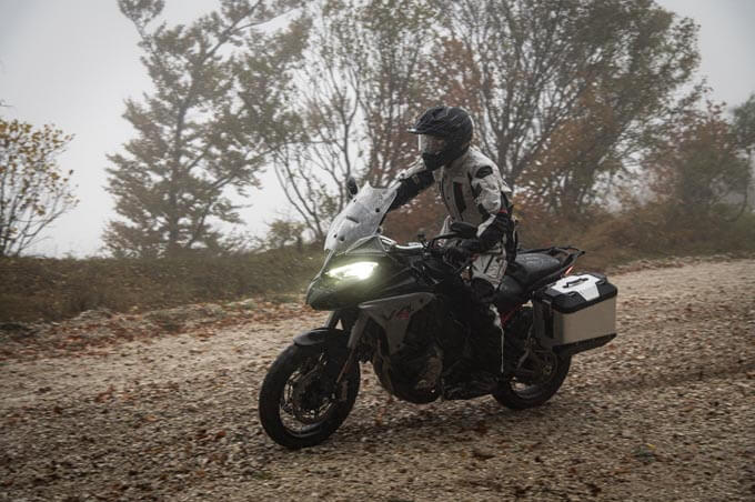 ダートセクションではオプションのクロススポークホイールにデュアルパーパスタイヤを装備した仕様に乗った。走行中に「エンデューロ」モードに切り替えるとエンジン出力が115psに抑えられ出力特性もよりマイルドに。電制サスは悪路に備えて自動的にプリロードを上げつつもストロークする設定となり、リア側のABSが解除されてトラコン介入度も最小限となる。簡単にいうとオフロードバイクに変身するわけだ。アルミ製ボックスを車体左右にマウントした状態だったが普通に走れるし、その気になれば後輪を軽く流しながらコーナーを立ち上がるアドベンチャーらしい走りもできてしまう。この巨体でオフロードを本気で走らせようというドゥカティの意思が強く伝わってきた。また、ACCやBDS、新たに追加された前方衝突警報などのアシスタンス機能も使ってみたが、とりわけ長距離ツーリングや悪天候時には頼りになるはずだ。