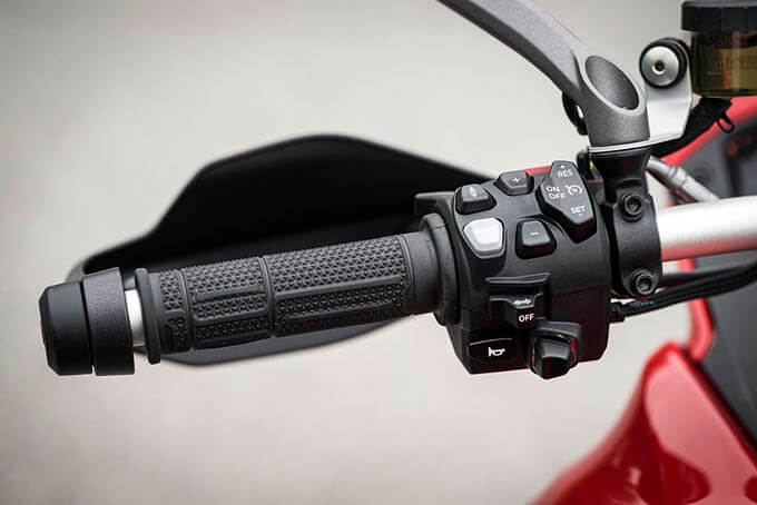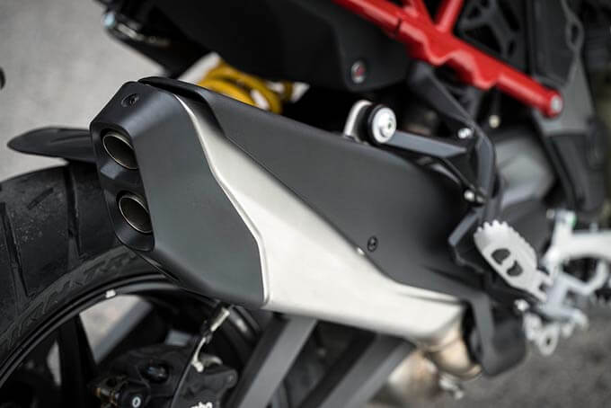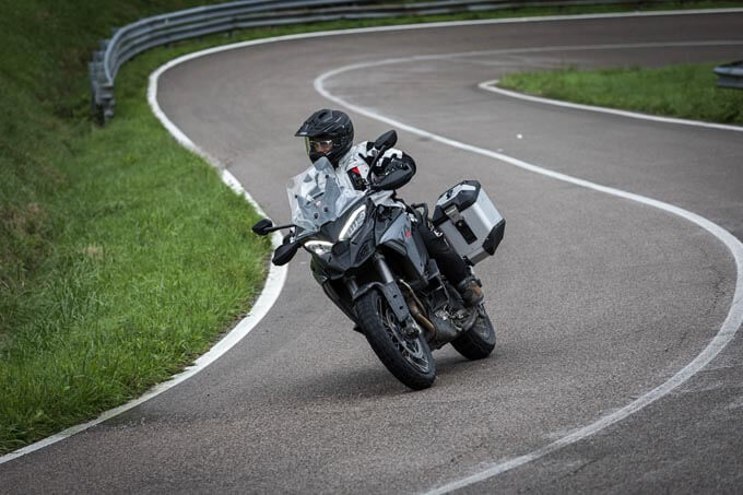 ライディングモードによってがらりとキャラが変わるのは従来どおり。市街地からワインディングに入りライディングモードを「アーバン」から「スポーツ」に切り替えると、アクセルのレスポンスが一段と鋭くなりエンジンパワーが盛り上がる。電子制御サスペンションによってリア車高が上がって減衰力も強くなり、走る気満々のスポーツ仕様に様変わりするのだ。V4エンジンの加速は強烈だが、鼓動はキメ細かくパワーデリバリーはスムーズ。低回転でも途切れないトルクはV4ならではで、次々に現れる急こう配のタイトコーナーもギアを落とすことなくグイグイ登っていく。ハンドリングも秀逸。軽快さの中に19インチホイールらしい安定感があり、狙ったラインをきれいに描ける正確さはドゥカティならではだ。