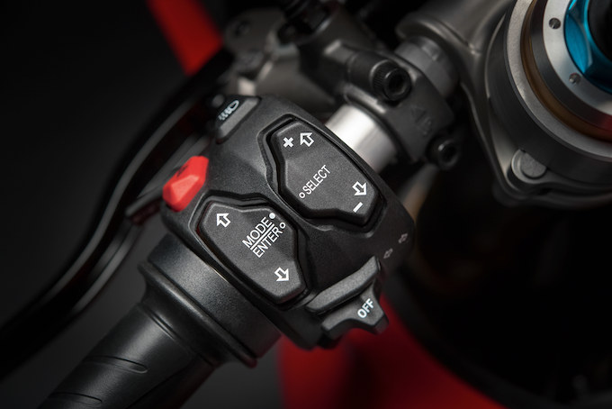 ライディングモード(STREET/SPORT/RACE)の切り換えやトラクションコントロールなどの調整はハンドル左側のスイッチボックスに備えられたボタンで即座に変更が可能だ。メーター内のグラフィックと連動し、直感的な操作が行える。