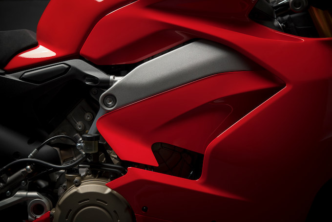 これまでドゥカティは、シリンダー挟み角が90度のエンジンのことを「L」と称していた。パニガーレV4Sも同じ90度ではあるが、エンジンの搭載角度が後方に大きく傾けられ、真横から見ると「V」に見えるため呼称が変わったのだ。