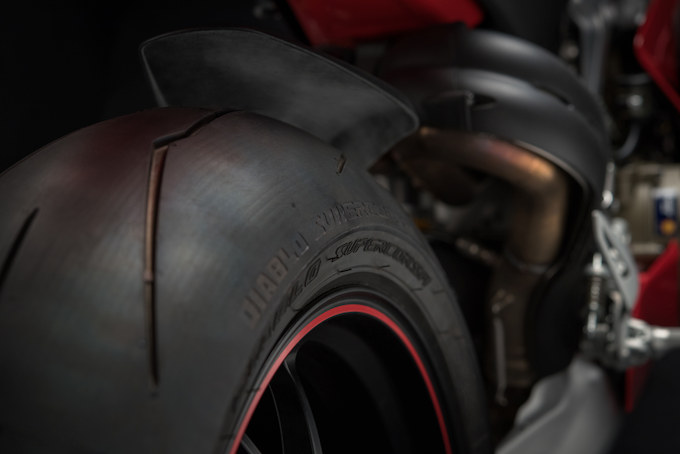 標準装着タイヤはピレリ製スーパーディアブロコルサSP。リアには同社のスリックタイヤと同等の200/60-17というサイズが専用に開発され、ハンドリングに貢献。接地面積が拡大し、フルバンク時のグリップ力が向上している。