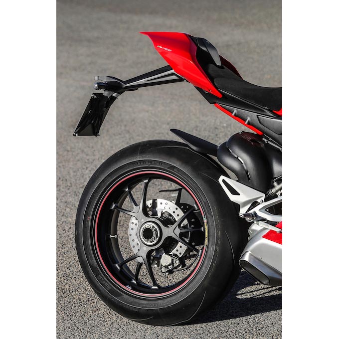 新デザインの3本スポークホイールはマルケジーニ製の鍛造アルミニウム合金。リアブレーキのABSは選択したライディングモード(RACE)や任意のレベル設定(レベル1)によって介入を解除することが可能だ。