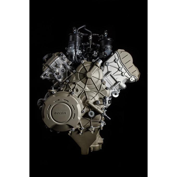 デスモセディチ・ストラダーレと呼ばれるV型4気筒エンジン。単体重量は64.9kgで、2気筒のスーパー・クアドロエンジンに対する重量増はわずか2.2kgだ。工場には専用のラインが設けられ、ほとんどが手作業で組まれている。