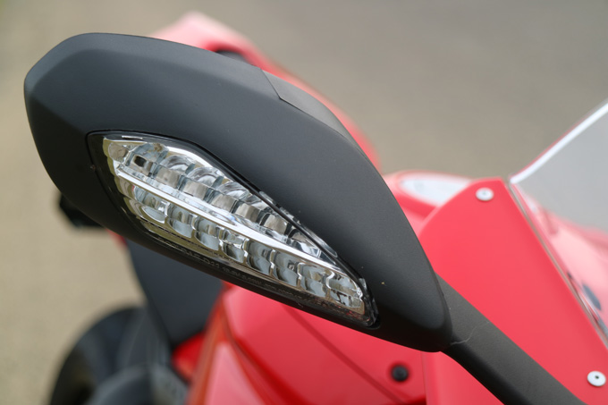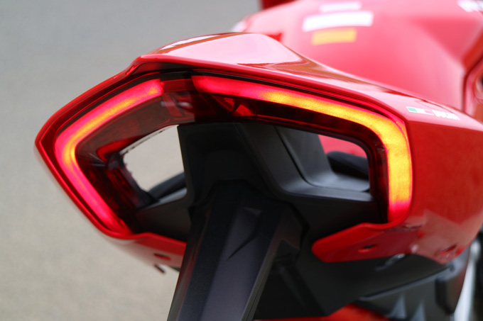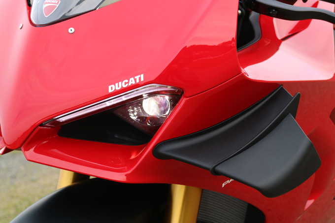 外観上で先代モデルとの違いは、サイドカウルのエアダクトの形状がリファインされていること、そしてエポックと言えるのがウイングレットの装備だ。ドゥカティはバイクレースの世界最高峰MotoGPのトップコンテンダー。先進的なマシン造り、特にエアロダイナミクスの分野では他メーカーの一歩も二歩も先を進んでいる。MotoGPマシンでのウイングレット装備について、その先鞭をつけたのはドゥカティだ。