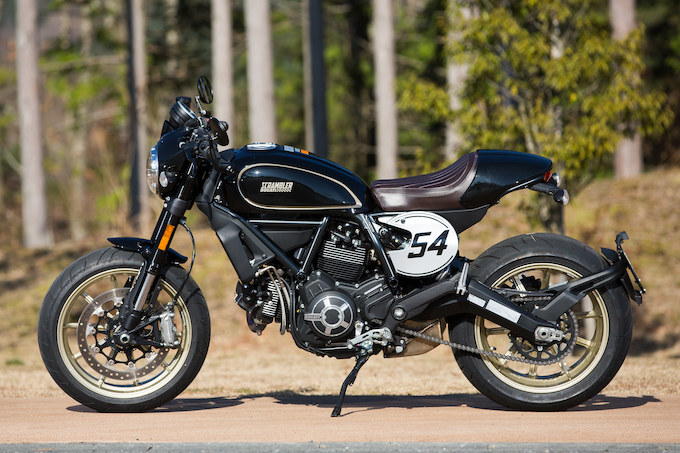 注目すべきは60年代スタイルへのこだわりだ。交換可能なアルミ製サイドパネルを備えたティアドロップ型タンクや、かつてドゥカティで活躍したワークスライダーが使った「#54」を配したラテラル・プレートホルダーを装備する。その他にも専用カバーが付いたシングル風シートやアルミ製セパレートハンドルの端にマウントされたミラー、ノーズフェアリングと短いフェンダー、2本出しテルミニョーニ製エグゾーストなど、60年代のカフェレーサーをオマージュしたデザインと機能パーツが散りばめられているのが魅力となっている。また、カフェレーサー専用アイテムとして、豊富なアクセサリー類が用意されているのもオーナーにとっては嬉しいところだろう。