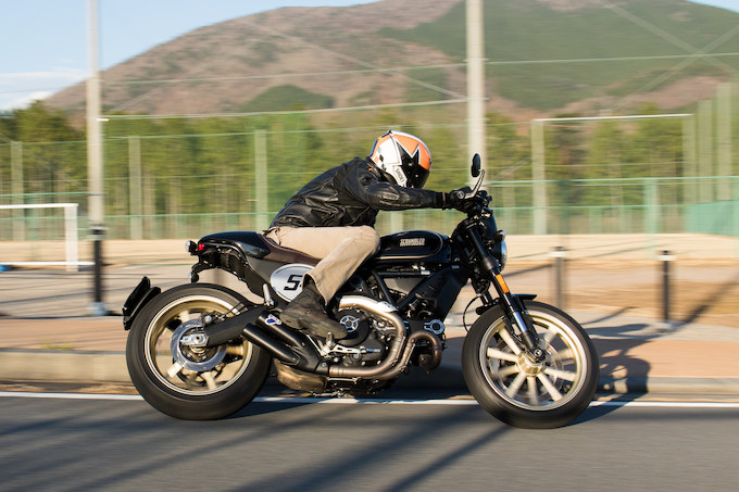 エンジンは低速から粘りがあって扱いやすく、空冷Lツインらしい柔らかなパルス感が気持ちいい。スロットルレスポンスにややダルさはあるが、基本的にパワーデリバリーはスムーズ。4,000rpm辺りからトルクが盛り上がって7,000rpm辺りまでが実用域だ。エンジンは回し過ぎず、そのレンジ内で小気味よくシフトアップしていくと楽しく乗れる。同じエンジンを搭載するモンスター797にも同時に試乗したが、エンジンの味付けとしてはカフェレーサーのほうがより穏やかだ。