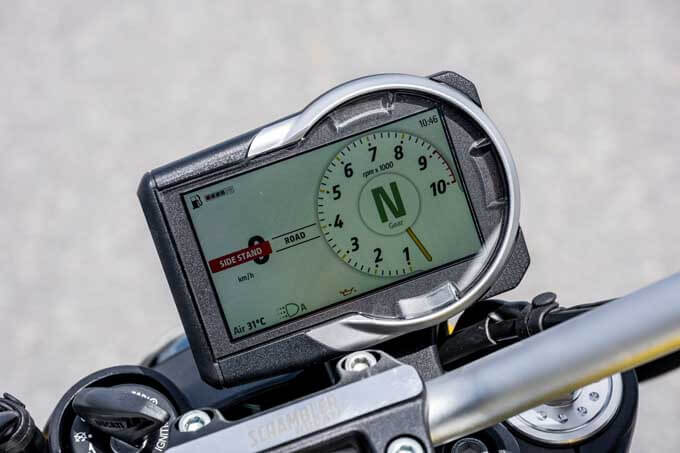 4.3インチTFTインストルメントパネルは至ってシンプル。速度、ライドモード、シフトインジケーター、タコメーター、時刻、ガソリン残量、外気温など必要最低限の情報を見やすく表示している。なお、走行距離を表示することもできる。