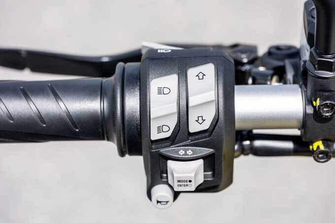 走行距離の表示やモード選択まで含めてディスプレイの操作は左手スイッチボタンに集約。バイクが動いている時は操作できない安全機能も搭載されている。