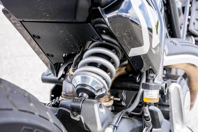 サスペンションは前後ともにKYB製で、リアショックは車体マフラー側にオフセットして装着されている。プリロード調整機能がついているので自身の体重や積載状況に合わせて調整可能だ。