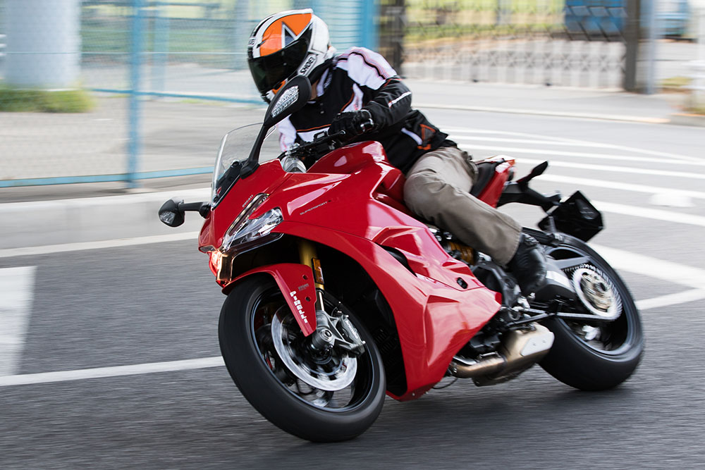 話が脱線したが、スーパースポーツなら国産モデルから乗り換えてもすんなり馴染めると思う。重心位置が比較的低くフラットな車体姿勢ということもあり、倒し込みから深くリーンしていくまでのバンク角のつき方やステアリング舵角の当たり方が、とても自然な感じで安心できる。また、フルカウルモデルとしてはハンドル切れ角も豊富で、極低速でも粘るエンジンとも相まってタイトターンもやりやすい。一方で高速コーナーでのライントレースの正確さはドゥカティならでは。豊富なフロントの接地感とともに、狙ったところにフロントタイヤを通していける感覚はパニガーレにも通ずるものがある。