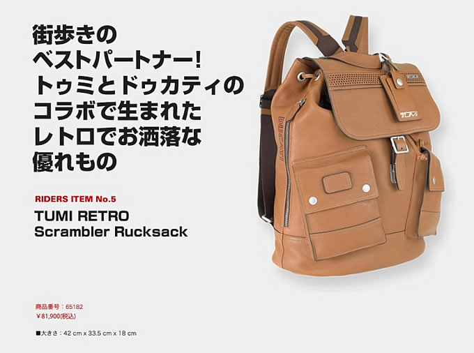 トゥミ(TUMI)とドゥカティのコラボレーションアイテムのバックパック。とにかく質感、手触りが良い。そして特徴的なのが、サイドのファスナーを開けると、背負ったままでも中の荷物を取り出せる機能。サイドの DUCATI 刺繍ロゴ、上部の TUMI メタルロゴの印象的なデザインもおすすめです。