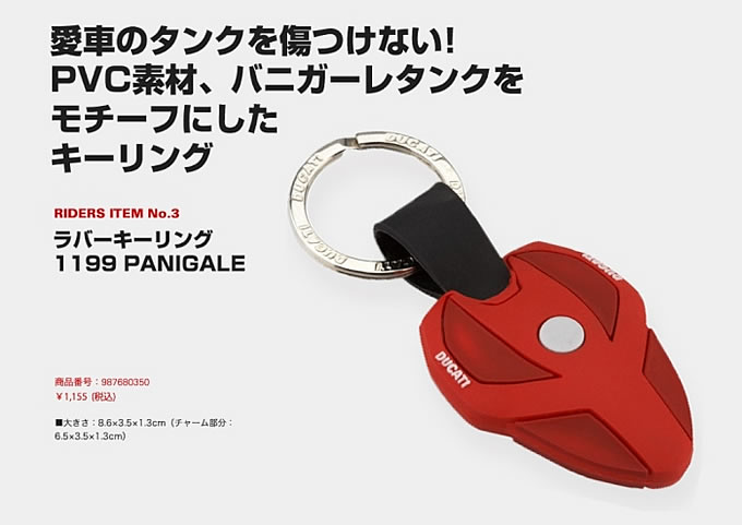 1199 PANIGALE のガソリンタンク(上方から見たアングル)をあしらったユニークなデザインのキーリング。リングの部分にドゥカティロゴが入るスペシャル感たっぷりのこだわりキーホルダーです。ポケットに入れても邪魔にならないソフトラバーを採用しています。