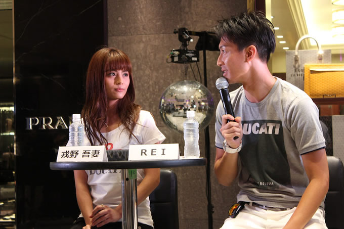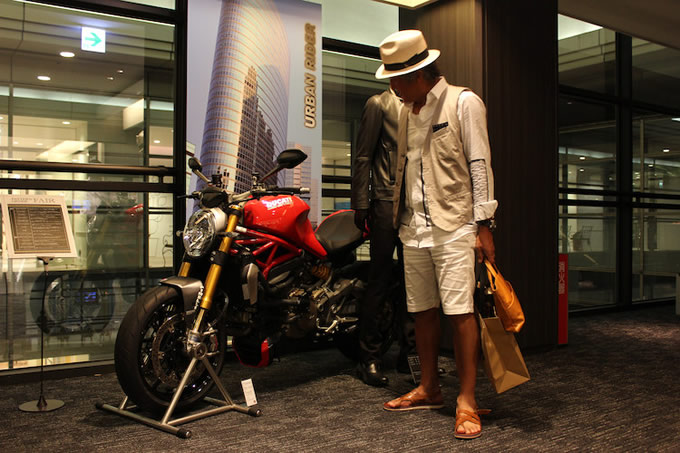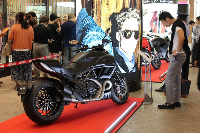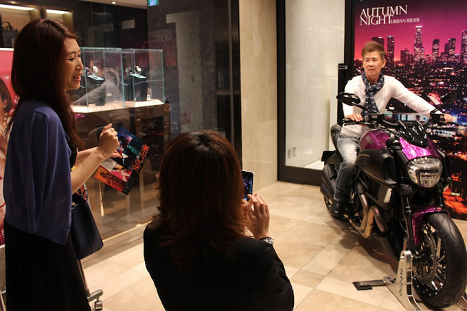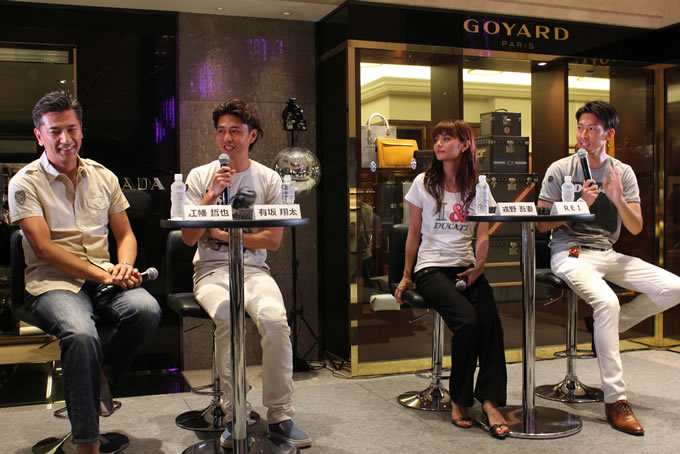 その第一弾として 2014年8月22日(金)、阪急 MEN’S TOKYO で開催されたオータムナイトセールの会場で DUCATI BRAND AMBASSADOR トークショーを行った。その中で4人は、それぞれのドゥカティとの出会いや、実際に乗って感じたことを語る。同時に、大型自動二輪免許を持っていない戎野さんの『免許取得宣言』も飛び出し、会場を沸かせた。さらに会場の一角には “Ducati Diavel 映画『ルパン三世』峰不二子スペシャル” も設置され、来場者は写真撮影を楽しんでいた。