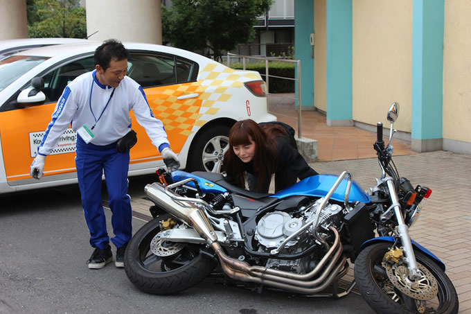 免許取得を宣言した戎野 吾妻さんは、トークショーとは別日に教習所へ入校。大型自動二輪免許の取得を目指す。