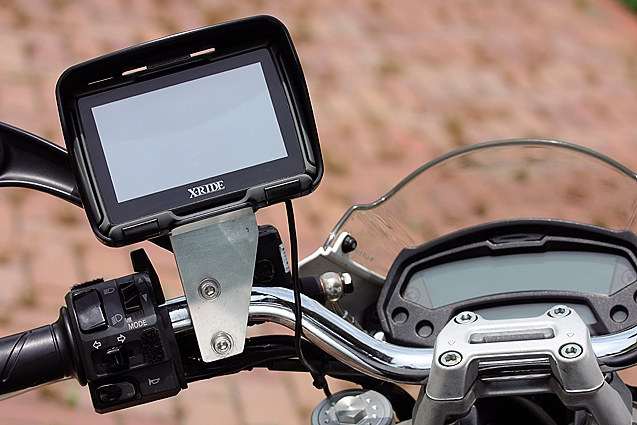 ツーリング派の菅野さんにとって、ナビゲーションシステムは欠かせないアイテム。取り付けステーは、菅野さんのご主人の手による自作パーツ。