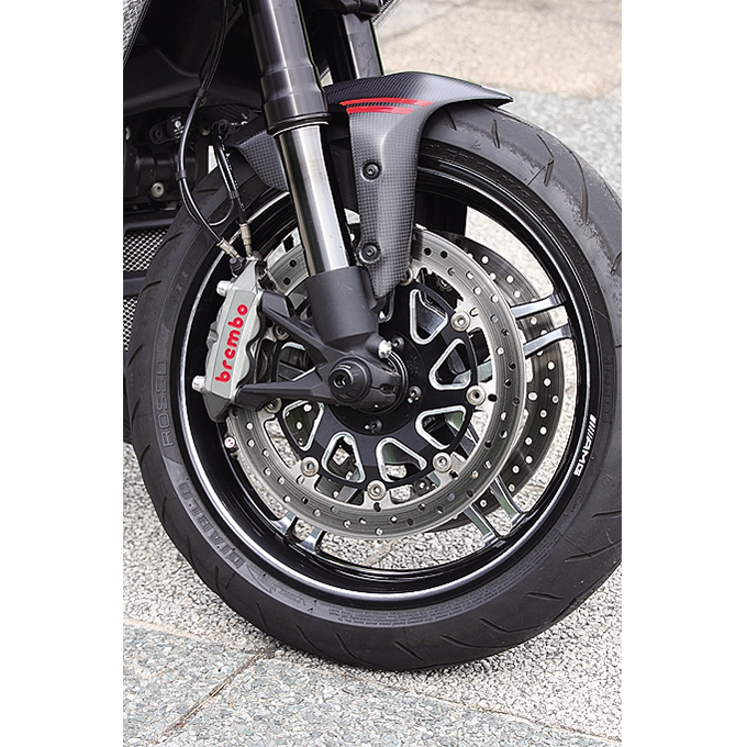 ホイールを前後ともにディアベルAMGの専用品に交換。フロントフォークのインナーチューブは極太φ50㎜、DLCコーティングが施されている。
