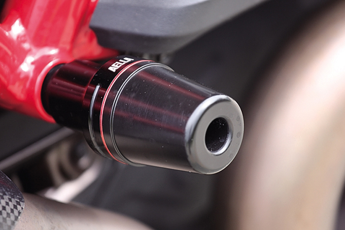 万がいちのアクシデントに備え、アエラ製のフレームスライダーと、フロントアクスルスライダーを装備。ルックス上のワンポイントにもなっている。