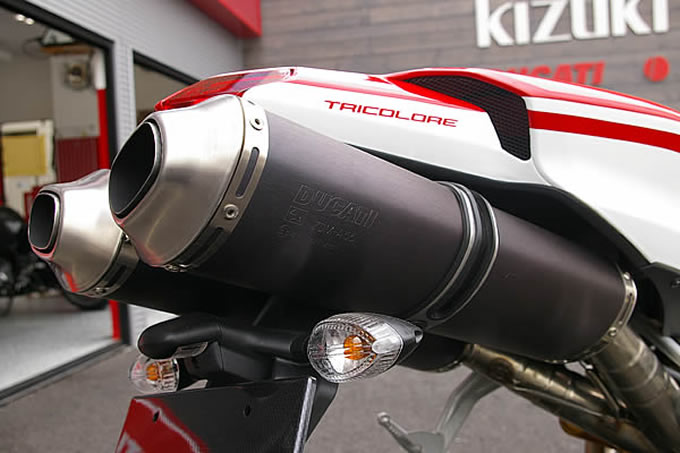 以前紹介したモンスターS4Rsトリコローレとほぼ同じ時期に、スーパーバイクシリーズにも同色のスペシャルモデルが存在していた。日本におおよそ70台ほど輸入された「スーパーバイク1098Sトリコローレ」がそれだ。こちらも基本的にはカラーチェンジがメインとなり、マシンスペックに大きな違いはない。ただ、限定モデルだけのスペシャルな要素として、ドゥカティパフォーマンス製のレーシングエキゾーストキットが付属する。こちらを装着してしまうと公道走行は不可になってしまうが、特別なモデルのオーナーにとっては嬉しい特典と言えるだろう。