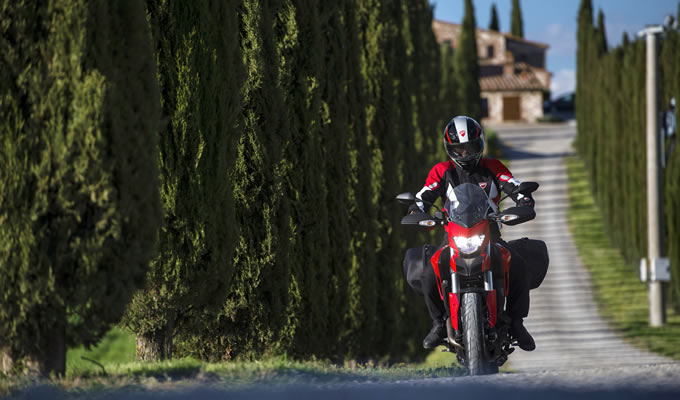 モトクロッサーのスタイリングを融合させたロードバイクがハイパーモタードだ。2014年にフルモデルチェンジを受け、空冷だったエンジンは排気量 821cc の水冷Lツイン『テスタストレッタ 11°』に刷新された。ライド・バイ・ワイヤの採用による3種のライディングモード、ABS、トラクション・コントロールを装備。リラックスした乗車姿勢は高い視界を得られるため、ビギナーでも扱いやすいのが特徴だ。ベースモデルとなるハイパーモタード、高性能パーツを装備したハイパーモタード SP、足つき性と高速巡航性をアップさせたハイパーストラーダの3モデルをラインナップする。2014年モデルから変更はない。