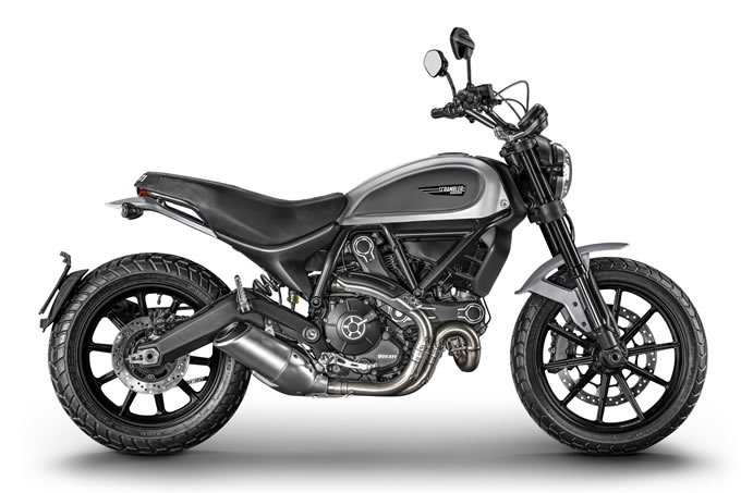 803cc空冷Lツイン「デスモデュエ」は、かつてモンスター796などに搭載され、扱いやすさとドゥカティらしい鼓動感を両立させたエンジン。フロント18インチ、リア17インチのアルミキャストホイールと幅広でアップライトなハンドルを組み合わせ、リラックスしたままライディングを楽しめるのがスクランブラーだ。街乗りからツーリングまで気軽にサッと乗り出せる。2017年から車体色にシルバーアイスが追加された。