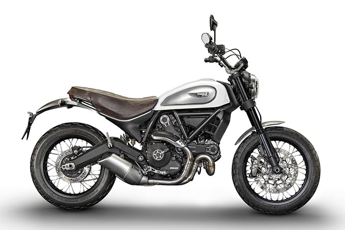 ドゥカティが1962年に発売した「スクランブラー」のイメージにもっとも近いディテールを持つモダンスクランブラー。アップタイプのハンドルバーとワイヤースポークホイール、アルミ製ヒートガード、ヴィンテージシート、アルミ製前後フェンダーを装備。とくにフロントフェンダーはショートタイプが装着されており、クラシックムードをいっそう高めている。