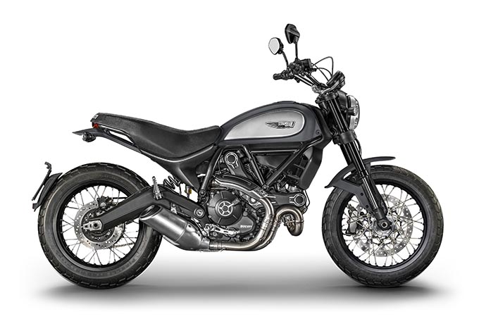2018年モデルとして新登場したスクランブラーで、803㏄空冷Lツインエンジンを搭載。フロント18インチ、リア17インチのアルミ製ワイヤースポークホイールの他、フロントフォークやエンジンヘッドカバー、ホイールリムをブラックアウトすることで精悍なイメージを構築。アップライトなハンドルバーが装着される。