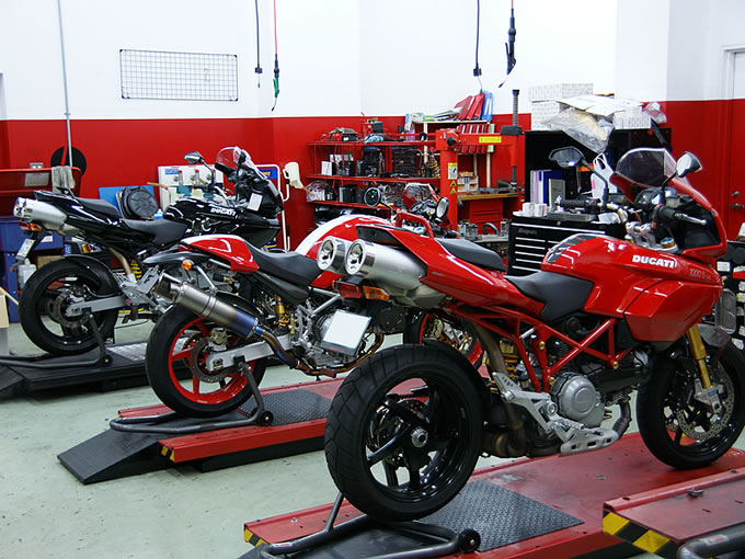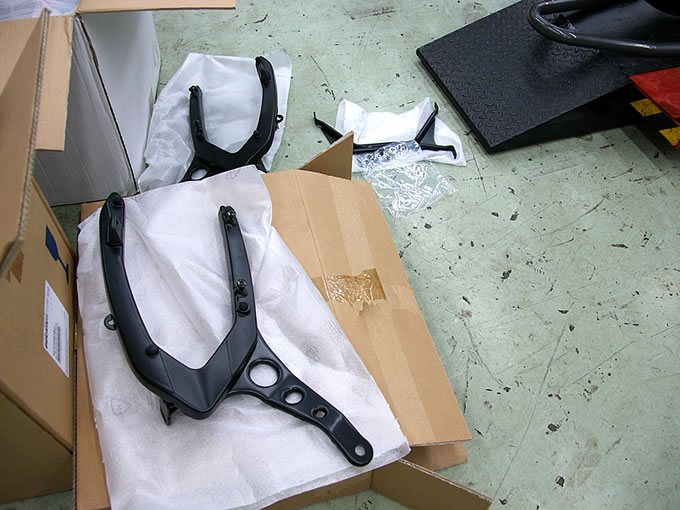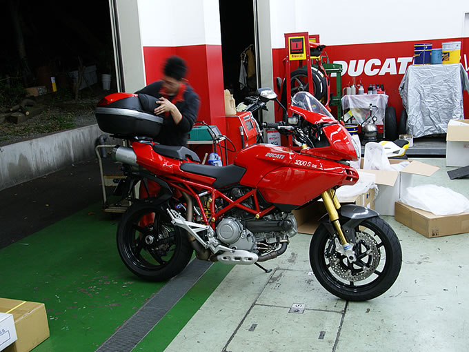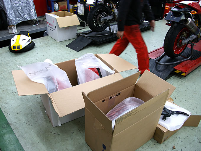 ということで、早速ドゥカティ横浜さんに直行。整備工場につくと、早速メカニックの方が例のブツが入った箱二つを持ってきてくれたのですが、さすがにケースが3つ分ともなるとデカイ。一瞬、「こりゃ、ちょっとやりすぎたかな」と思ったのですが…。