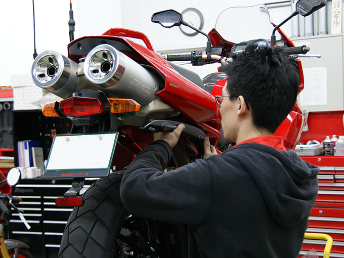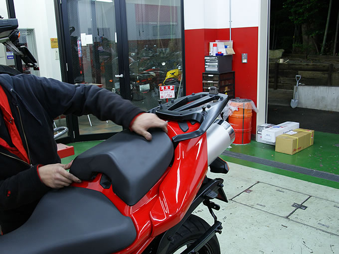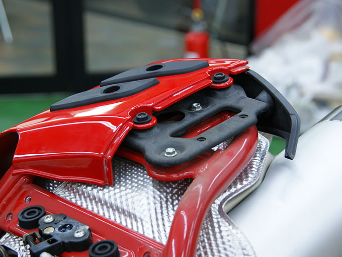 心配をよそに、メカニックの方がパパッと梱包を解くと、いよいよケース本体が見えてきました。トップ、サイドともにケースはイタリアのGIVI製です。イタリアンレッドの塗装の美しさもさることながら、一番感心したのはバイクとケースを連結するブラケット類もちゃ~んとデザインされていること。過去、ケース類を装着したバイクは何台も見てきましたが、ここまで徹底してデザインされたブラケットは見たことがありません。「さすが! イタリアンはいちいち洒落てるね~」と、一人悦に入っている新米オーナーをよそに、作業はテキパキと進行。