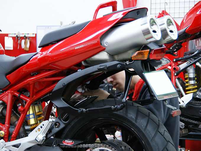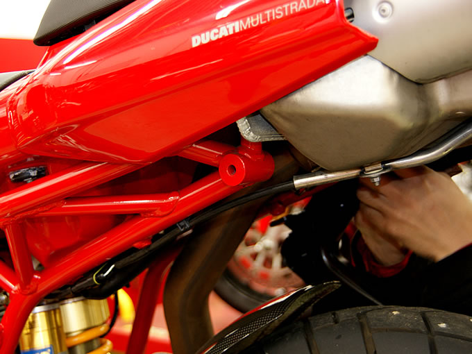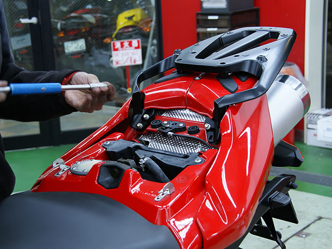 作業はまず、サイドケースの左右ブラケットを装着するところから始まります。以前から「何のため?」と思っていた、美しいサブフレームに設けられた穴を利用してブラケットをボルトで連結。さらに、タンデムステップホルダーにもボルト締めし、最後に、左右のブラケットを“X”型のステーで連結します。見ているだけで、実に合理的かつ丈夫な構造であることが分かります。次の作業は、タンデムグリップをトップケースブラケットに交換すること。この作業はやや煩雑で、シートカウル類はいったん全て取り外さなくてはなりませんが、やはり何の問題もなく装着完了です。作業中、メカニックの方が教えてくれたのですが、近年のドゥカティは、こうしたブラケット類の精度が著しく向上したとのこと。一昔前のこうした作業では、ちょっと削ったり、曲げたりすることが珍しくなかったそうですが、確かにここまでの作業は実にスムーズ。全てのブラケットを装着するのに要した時間は20分程度、タンデムライダー用の背もたれをトップケースにつけたり、細かいブッシュ類をはめ込んだりする最終工程を含めても、作業時間はトータル30分強という感じでした。